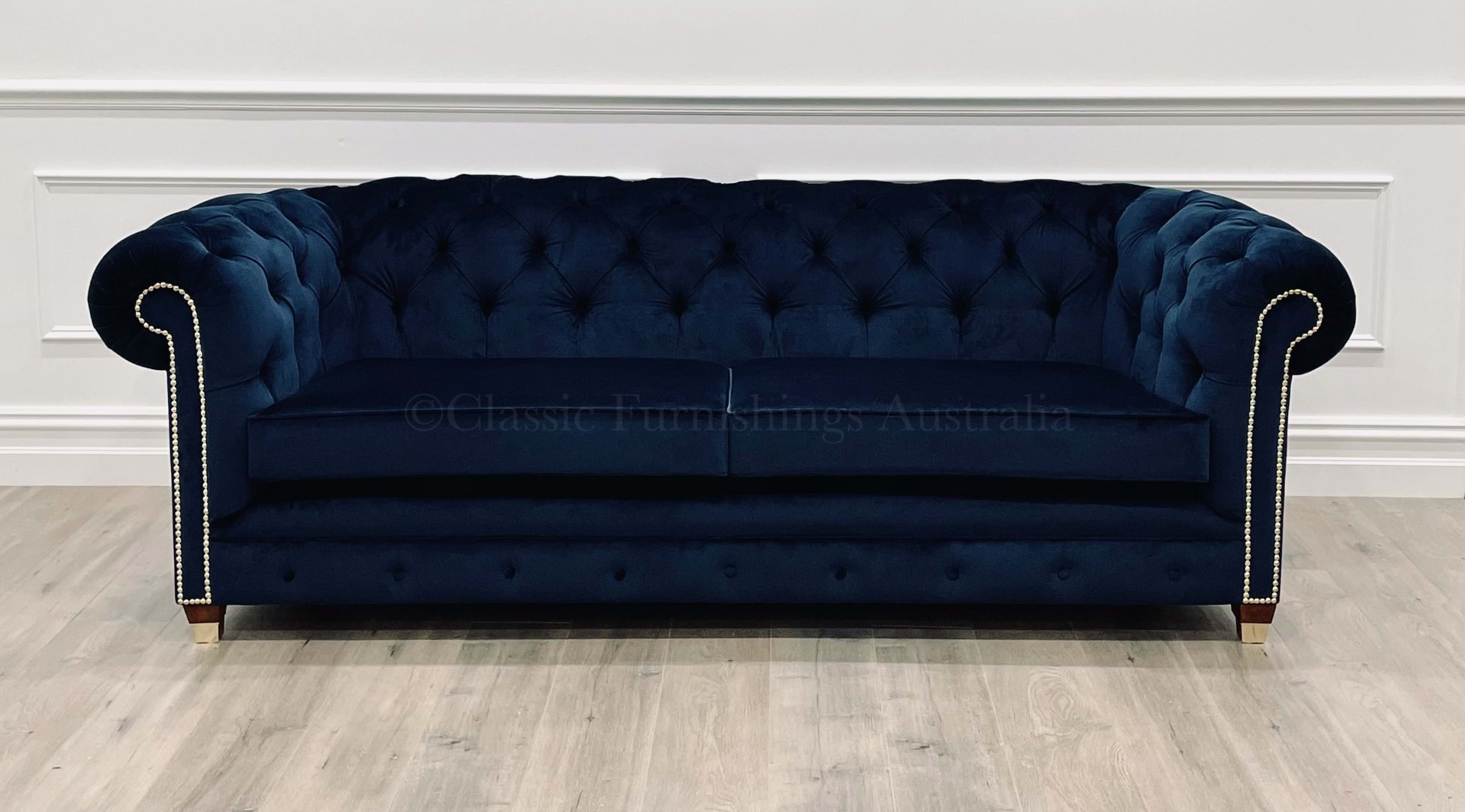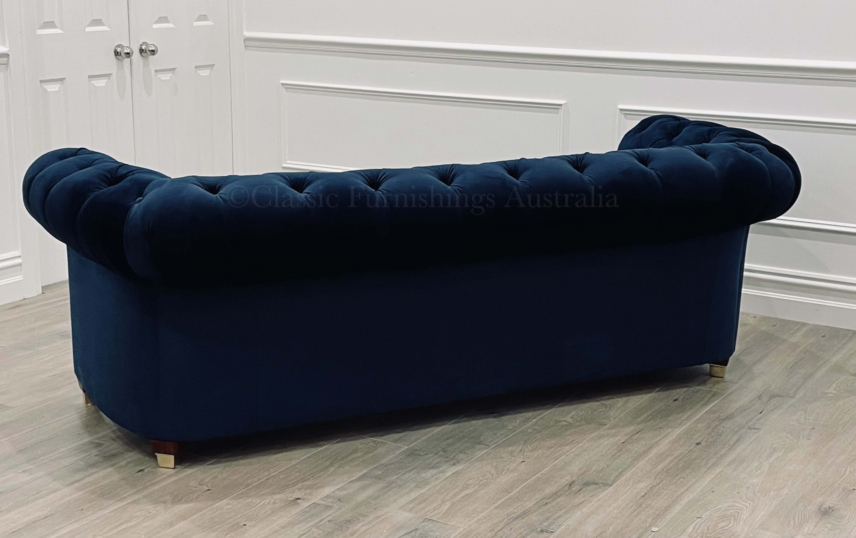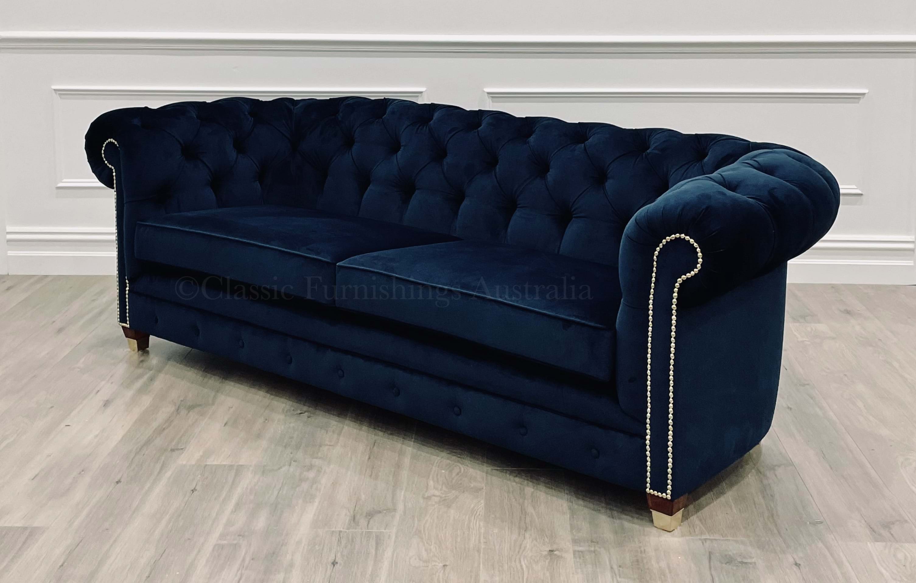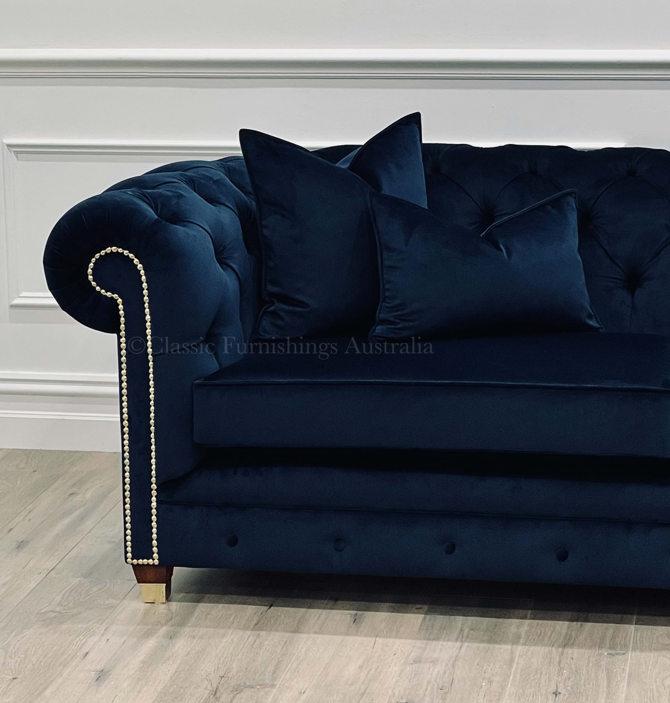 Known for her chic and stylish design, our Monica with her curved base, classic hand-tied buttoning, deep seating for comfort and complimented by the stud detail and gold capped feet is perfect for creating a that stylish interior.